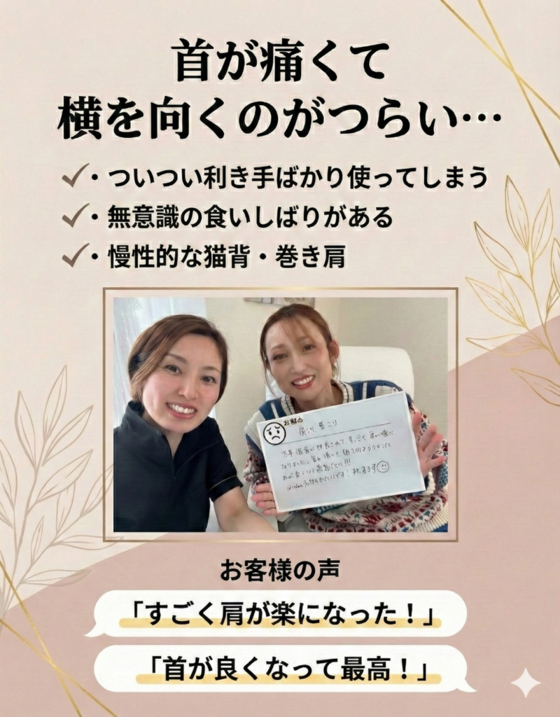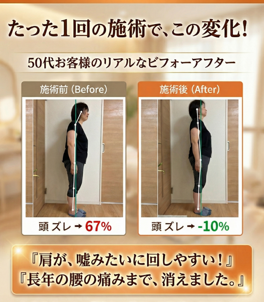 A. 1回の施術で「体が軽くなった」と実感される方が多いですが、慢性的な肩こりや姿勢のゆがみを根本から変えるには、3〜6回程度の継続をおすすめしています。脳と体が「正しい姿勢」を覚えるまでの期間を一緒に作っていきます。