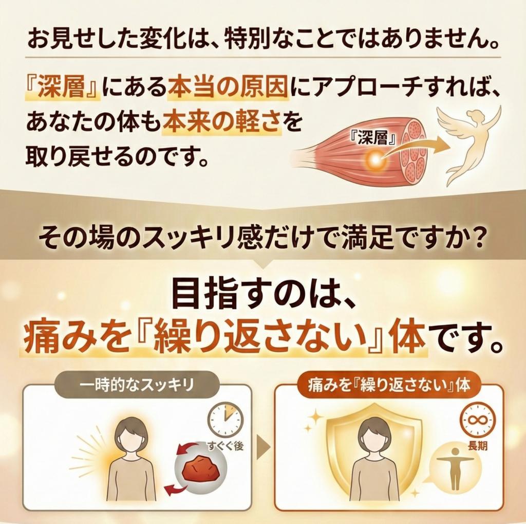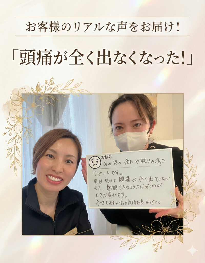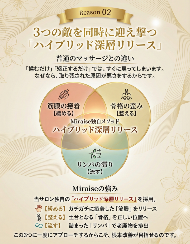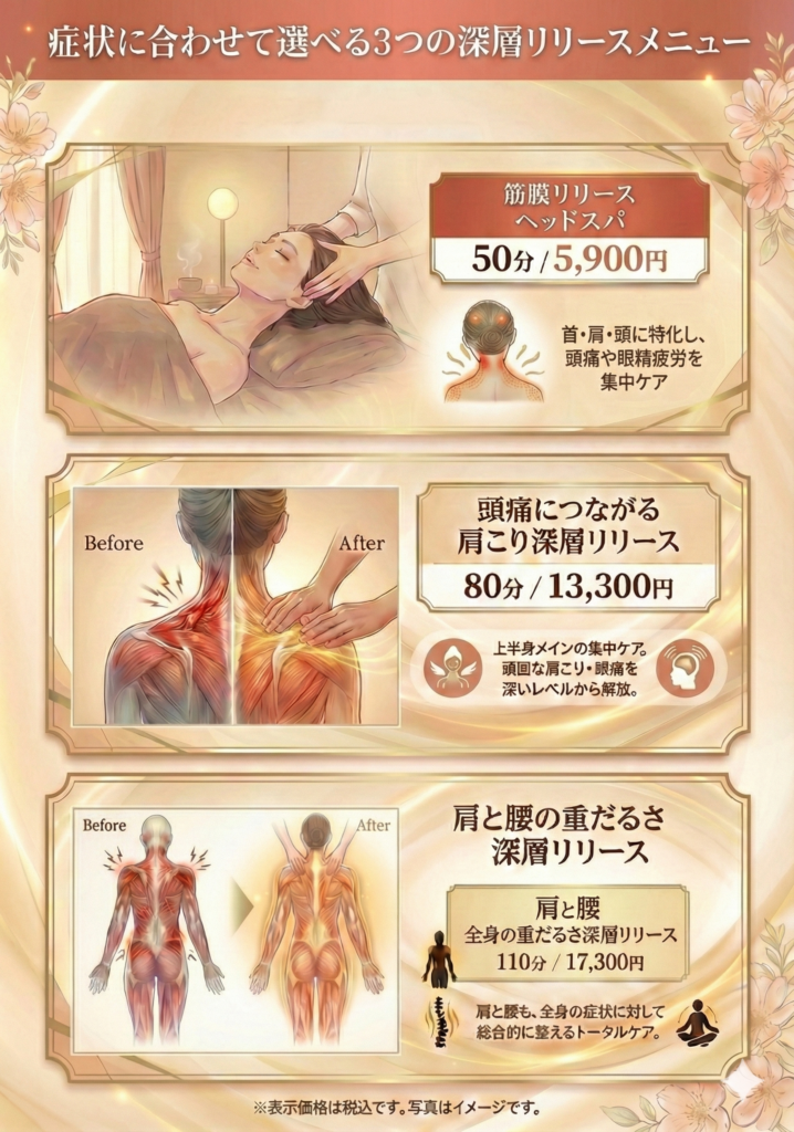 A. 一時的なリラクゼーションではなく、肩こり・頭痛の根本原因にアプローチする点です。当サロンでは、以下の3ステップで徹底的にケアします。