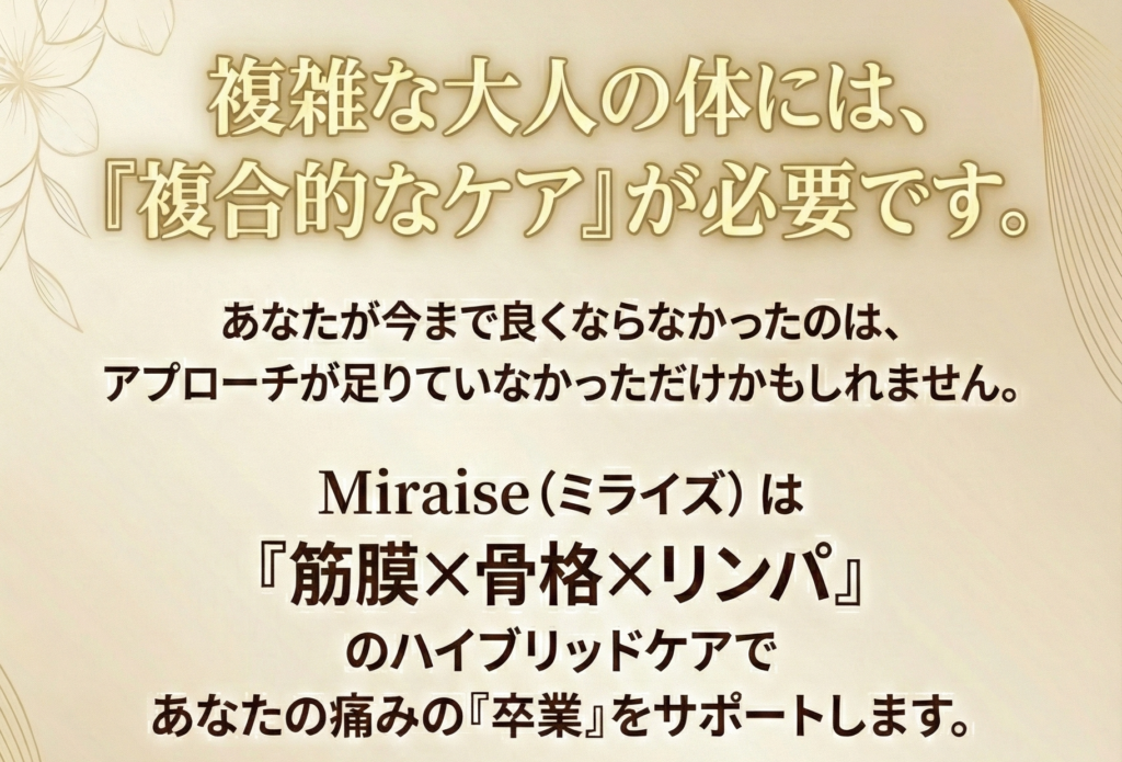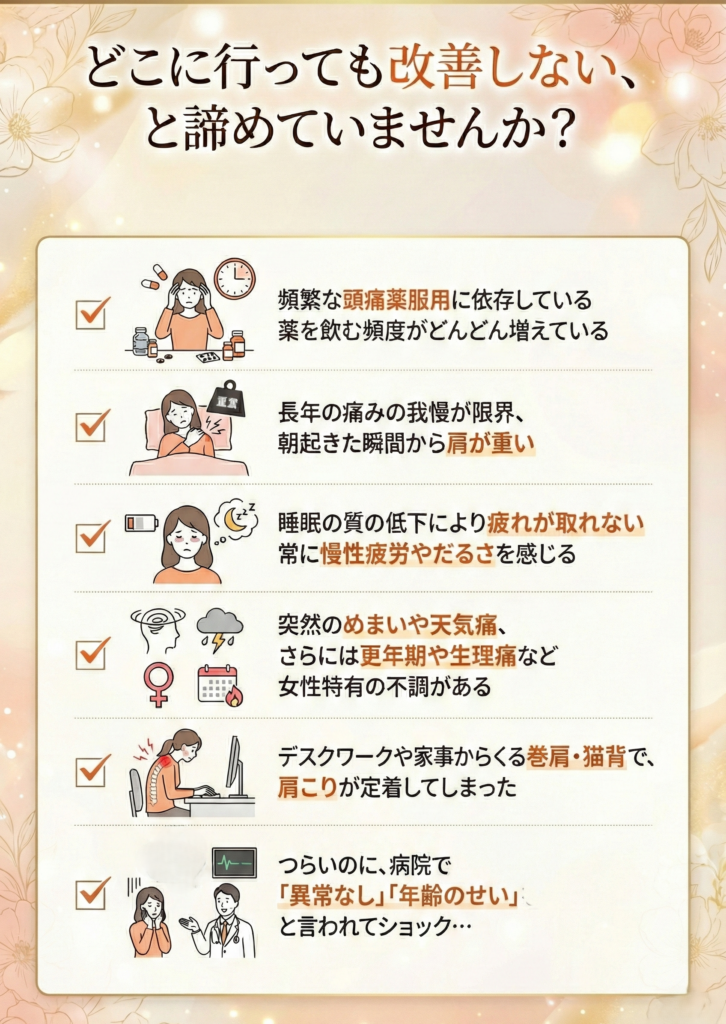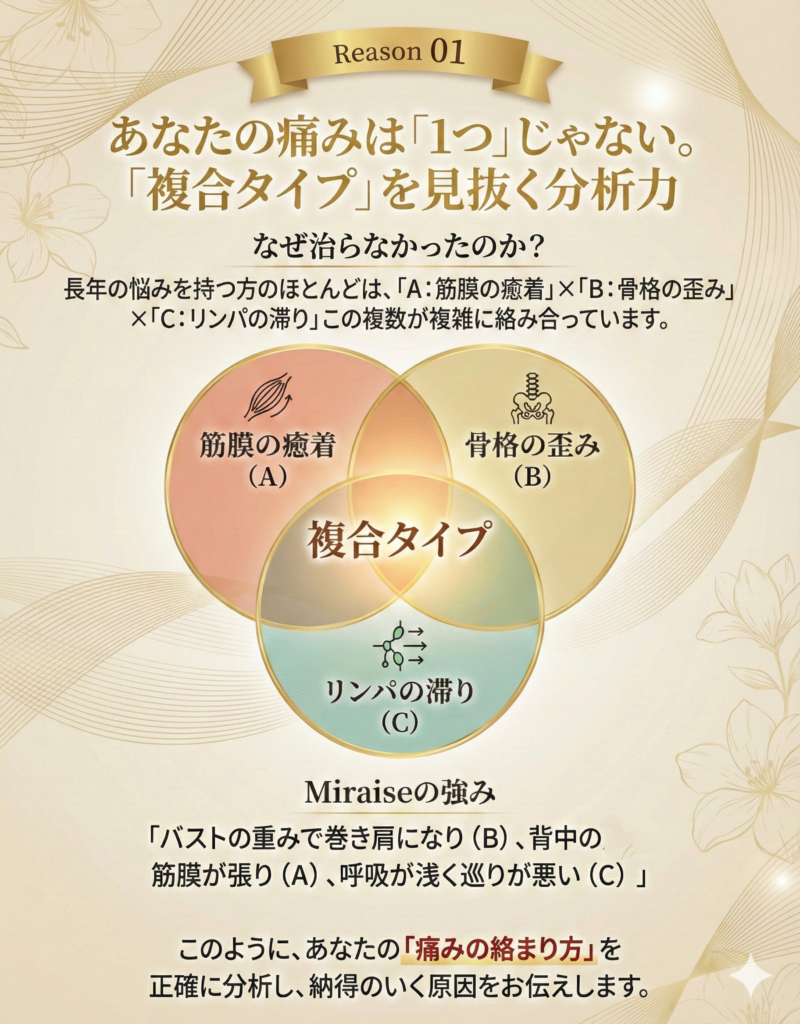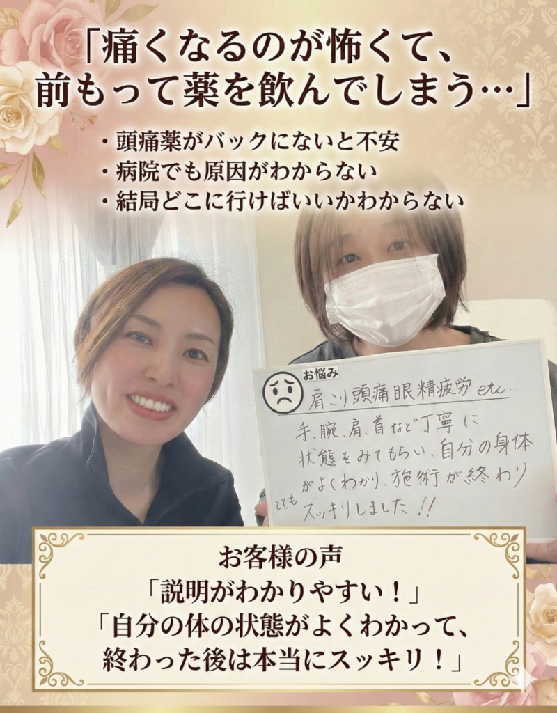 A. 一時的なリラクゼーションではなく、肩こり・頭痛の根本原因にアプローチする点です。当サロンでは、以下の3ステップで徹底的にケアします。