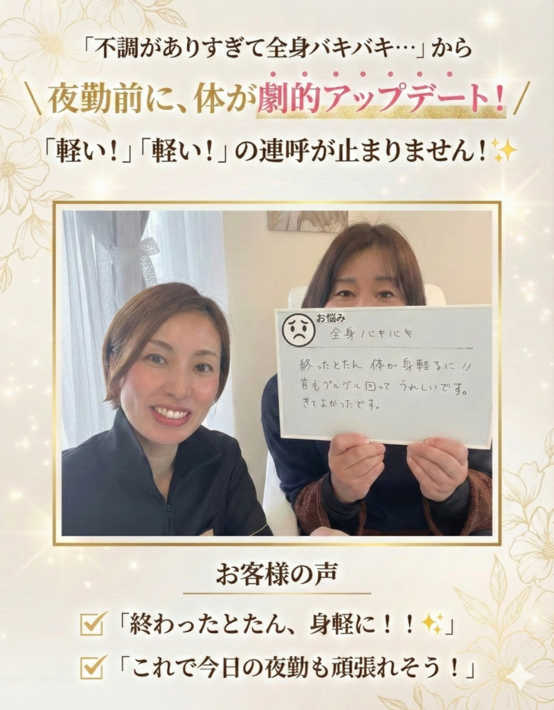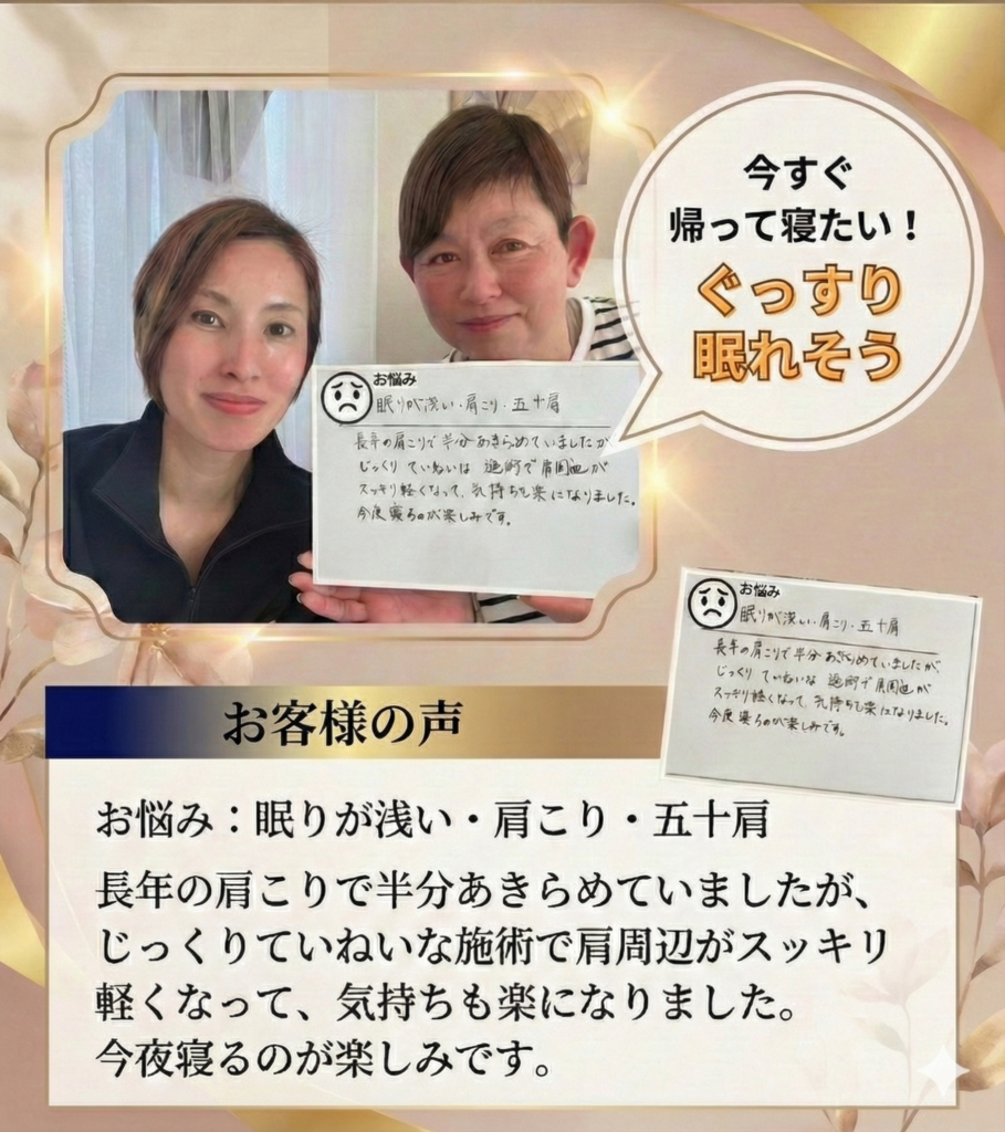 A. ライフスタイルにより個人差はありますが、施術に加えて「寝る前の簡単セルフケア」を取り入れることで、持続力は格段にアップします。アフターフォローとして、ご自宅でできる簡単なストレッチもアドバイスしております。