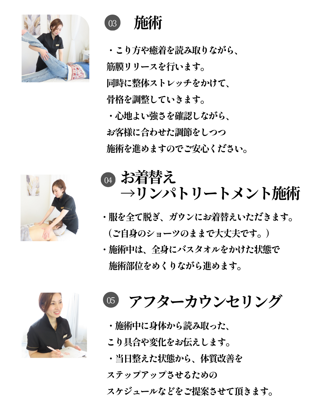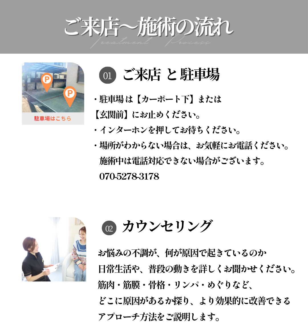 お客様のお身体と本気で向き合うための大切な時間ですので、お時間には余裕を持ってお越しくださいませ。