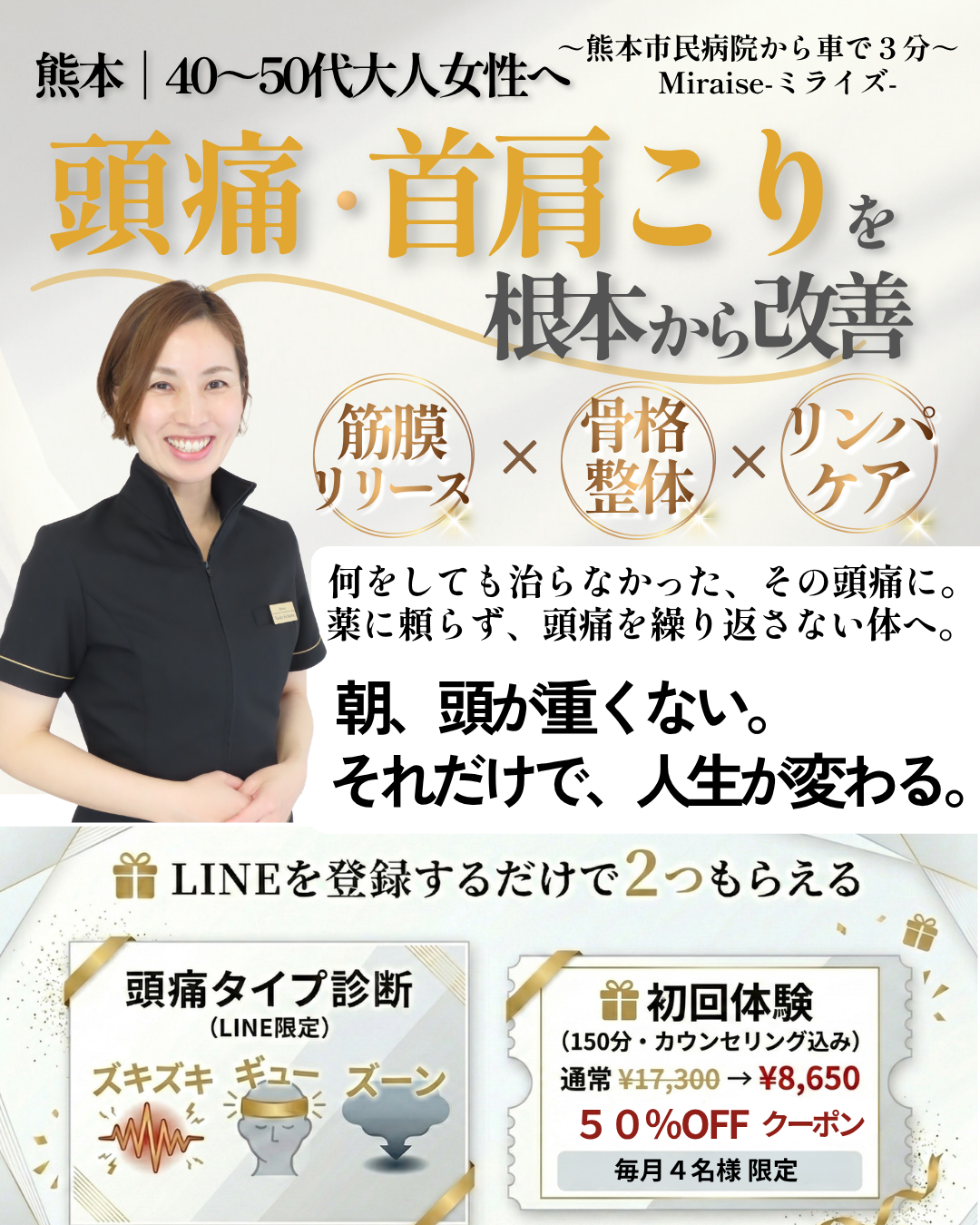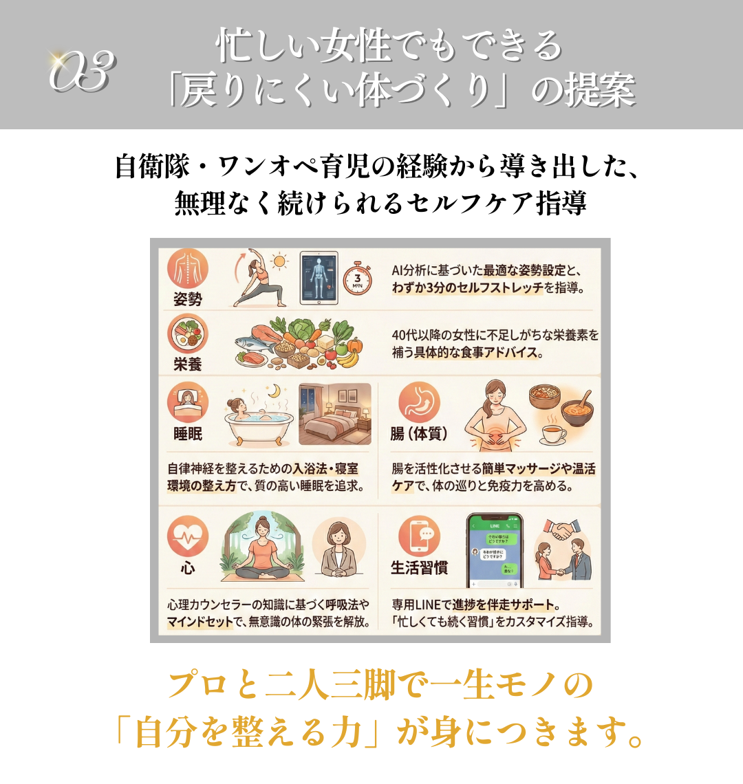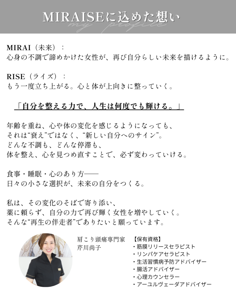 ただ筋肉を揉むだけでなく、筋膜・骨格・リンパ・自律神経の4つの視点からアプローチし、痛みを繰り返さない体づくりを二人三脚でサポートする【伴走型】のサロンです。