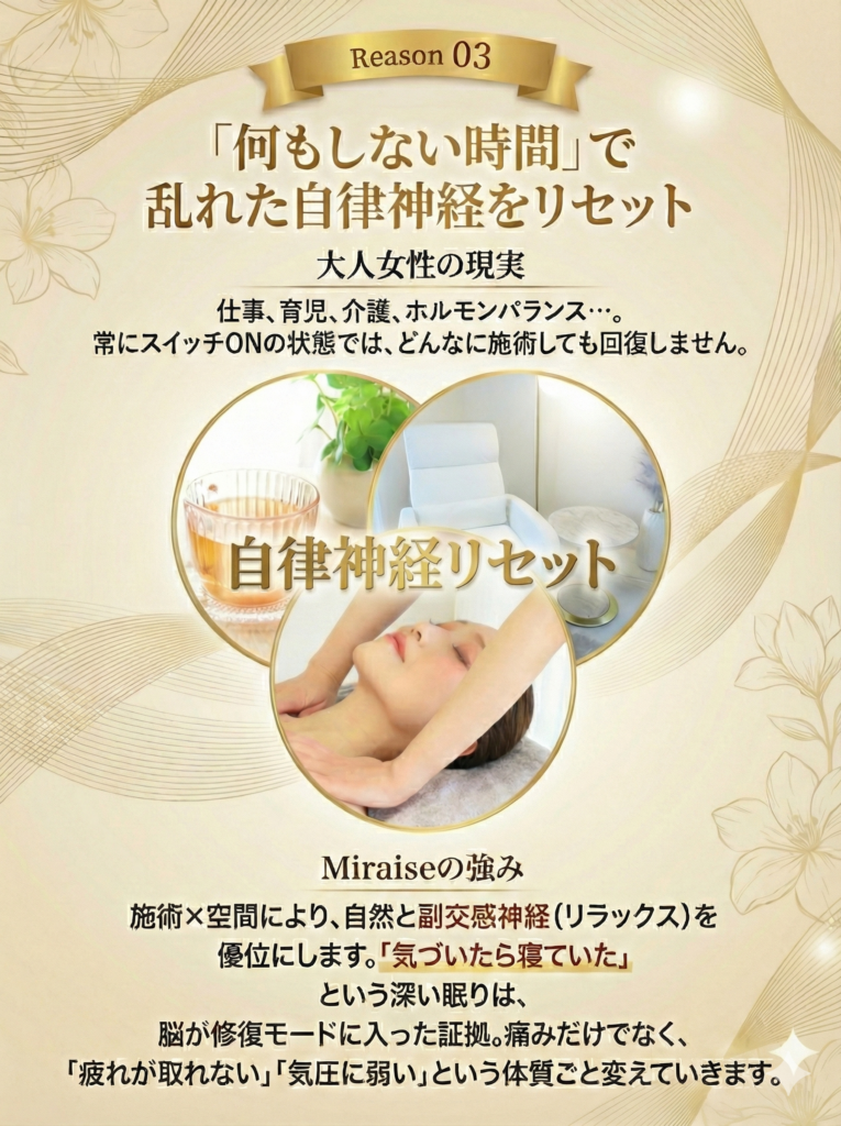 A. 一時的なリラクゼーションではなく、肩こり・頭痛の根本原因にアプローチする点です。当サロンでは、以下の3ステップで徹底的にケアします。