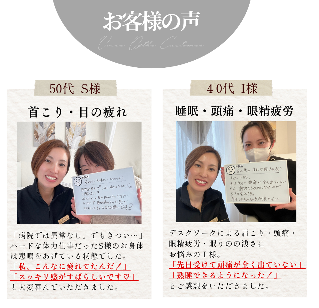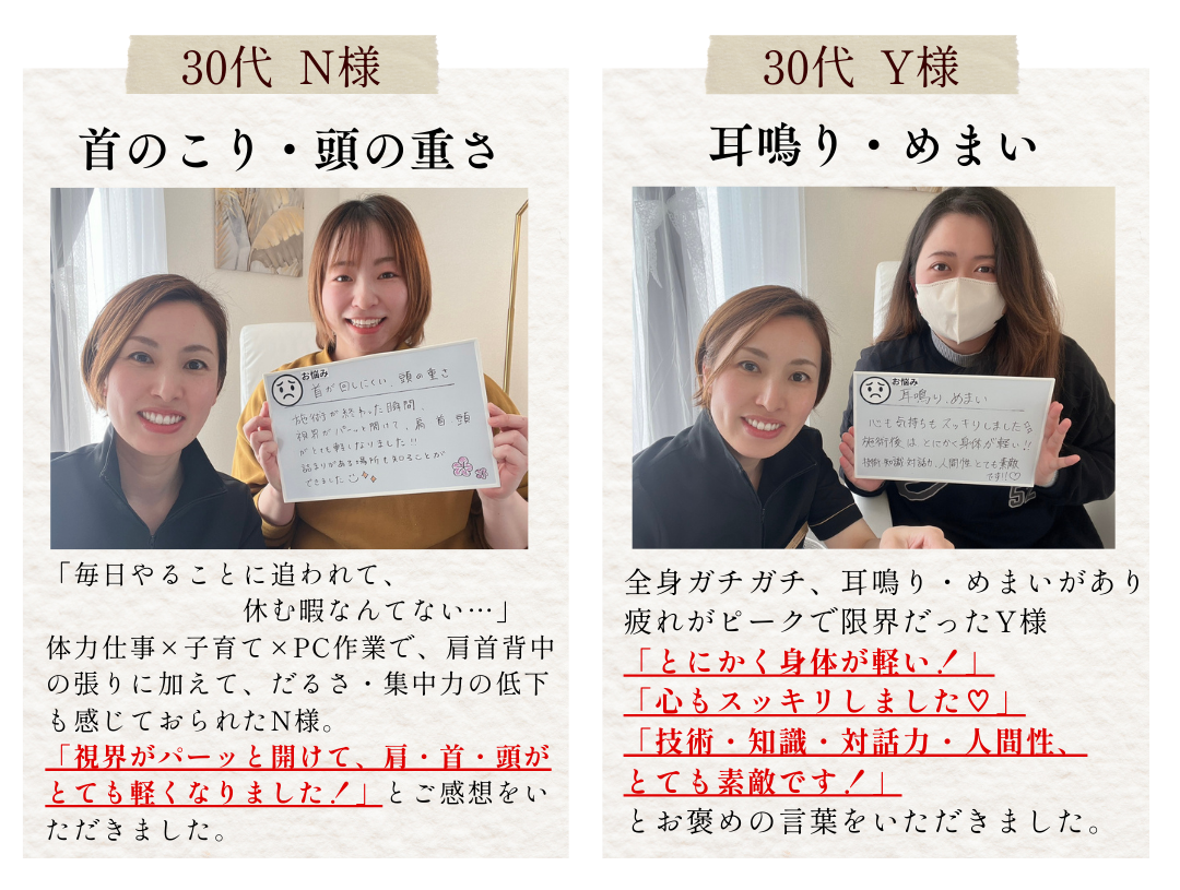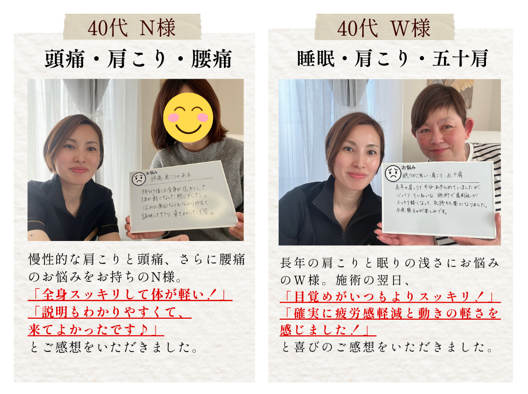 「ズーンと響く」感覚があるかもしれませんが、都度力加減をお伺いしながら進めますので、痛みが苦手な方もご安心ください。