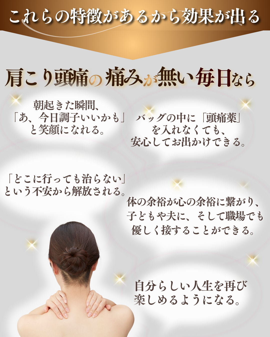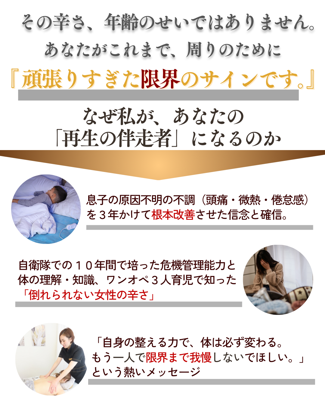 A. その場しのぎのリラクゼーションではなく、「不調の本当の原因」を全身から見つけ出し、根本から改善する点です。