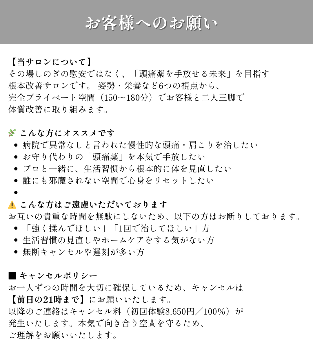 当日のキャンセルの場合は、施術料の100%を頂戴しておりますので、何卒ご理解とご協力をお願いいたします。
