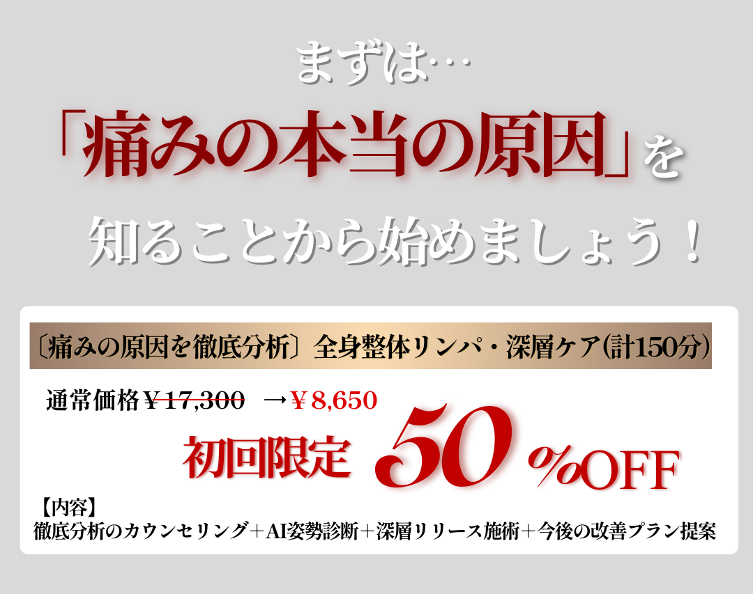 当サロンでは、初回の徹底分析の結果をもとに、あなたのお身体に一番合った「痛みを卒業するための最短ルート(通い方)」はプロとしてお伝えさせていただきますが、都度払いメニューもご用意しております。
