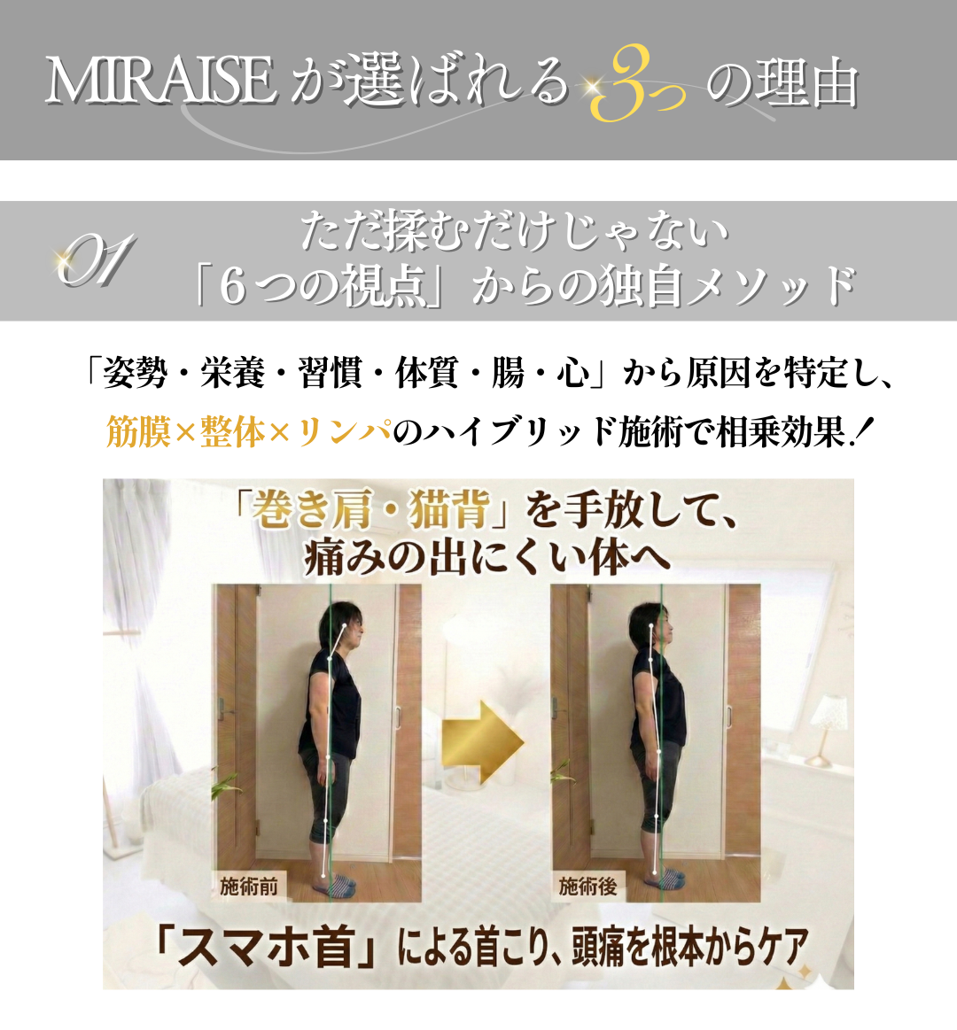 ただ筋肉を揉むだけでなく、筋膜・骨格・リンパ・自律神経の4つの視点からアプローチし、痛みを繰り返さない体づくりを二人三脚でサポートする【伴走型】のサロンです。